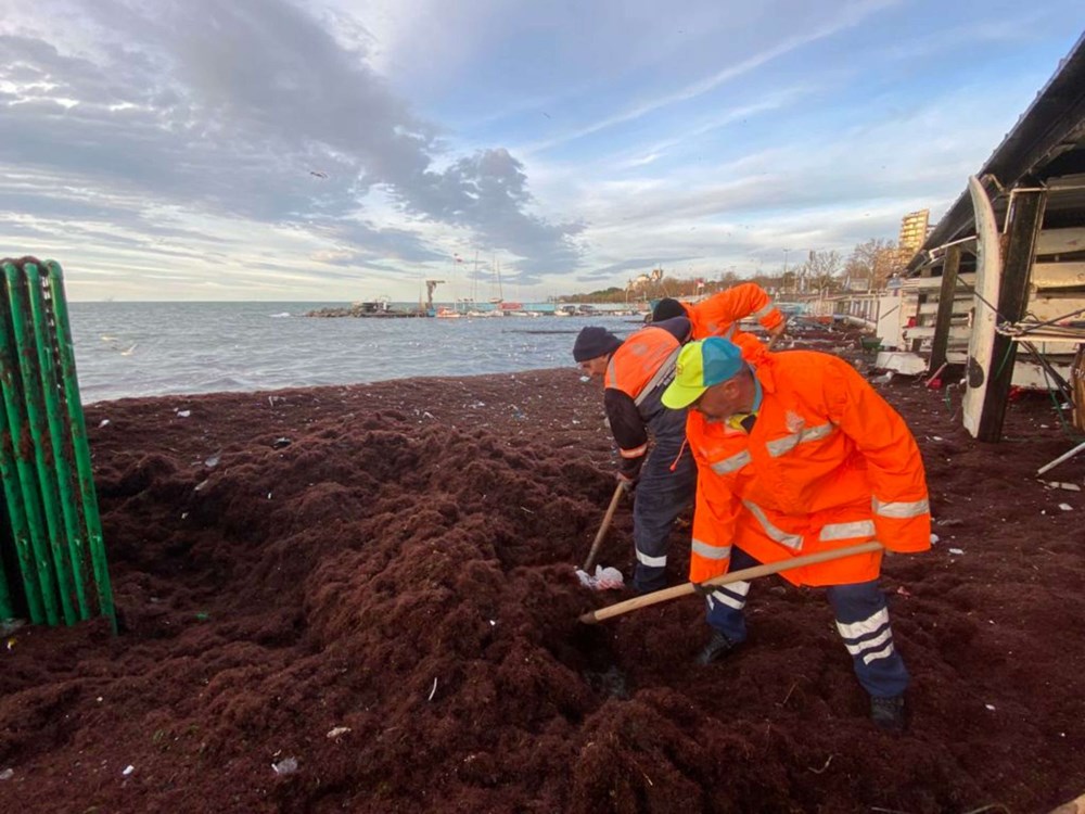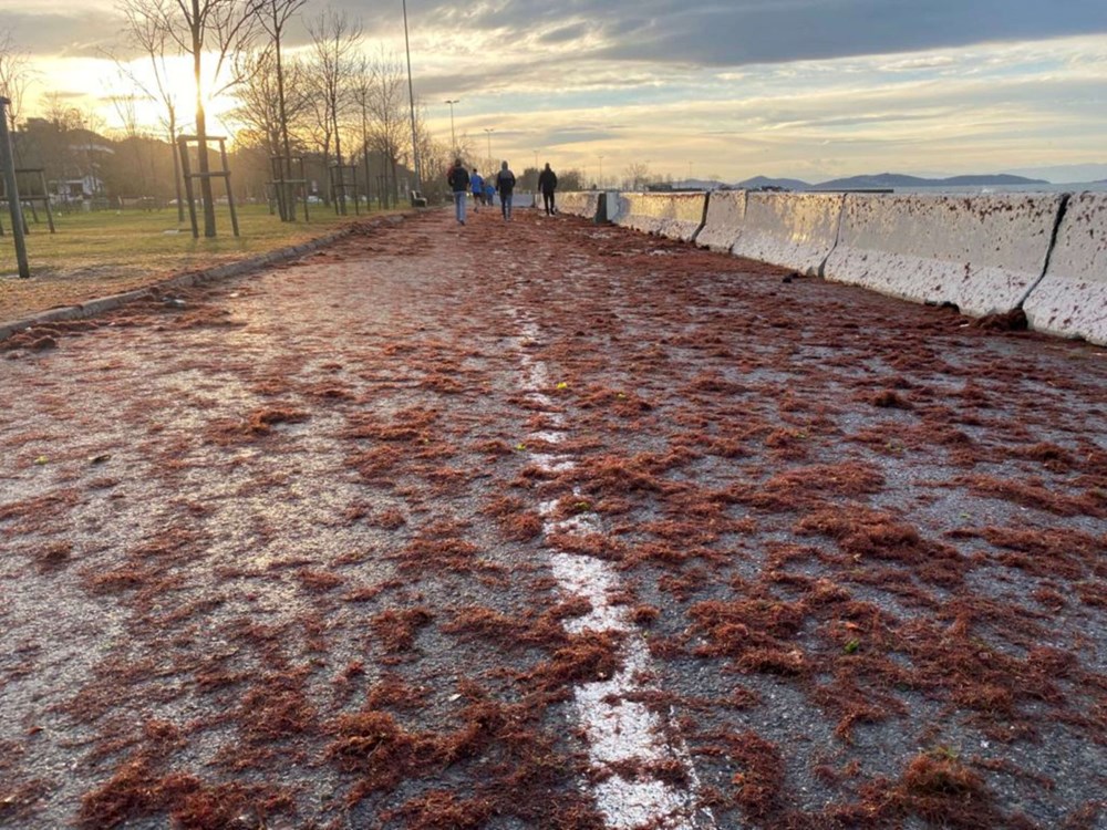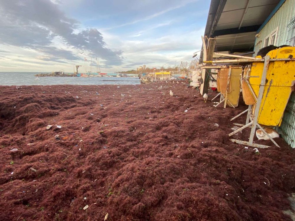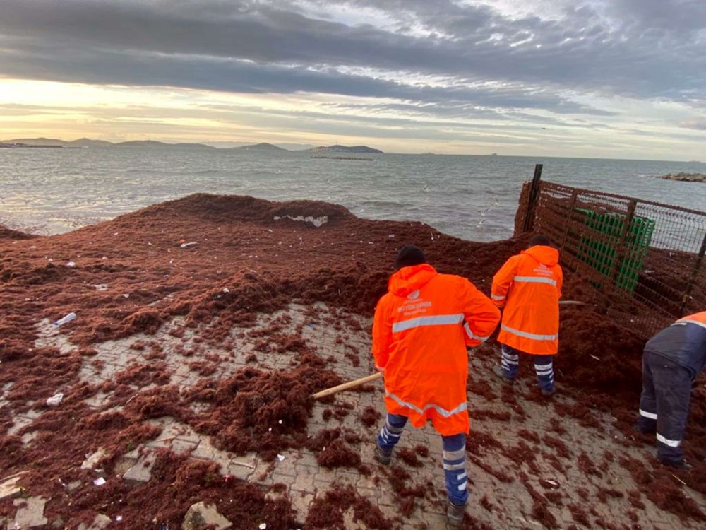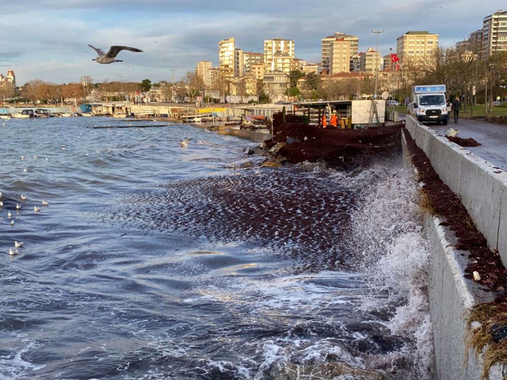 İstanbul'da dün akşam saatlerinden itibaren etkili olan fırtına ve dalga sonrası Caddebostan sahili yine kırmızıya büründü. Dev dalgalarla birlikte kıyıya vuran kırmızı renkli yosunları temizlemek için İBB ekipleri çalışma başlattı.
