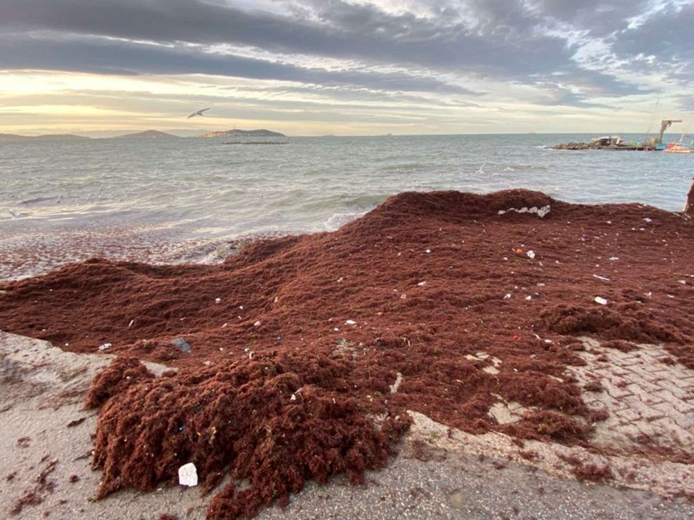 İstanbul'da dün akşam saatlerinden itibaren etkili olan fırtına ve yağmur nedeniyle Kadıköy Caddebostan sahilini yine kırmızı yosunlar kapladı.